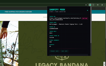 Shopify Peek es una extensión para Chrome diseñada para desarrolladores y propietarios de tiendas Shopify que permite inspeccionar rápidamente cualquier sitio impulsado por Shopify. Con un solo clic en el icono de la barra de herramientas, los usuarios pueden obtener información detallada sobre el tema utilizado, incluyendo el nombre, ID, rol y ID de la tienda de temas, así como datos de la tienda como la moneda, el país y la configuración regional. Además, proporciona la URL de vista previa del tema activo y datos JSON de productos y carritos en las páginas correspondientes.